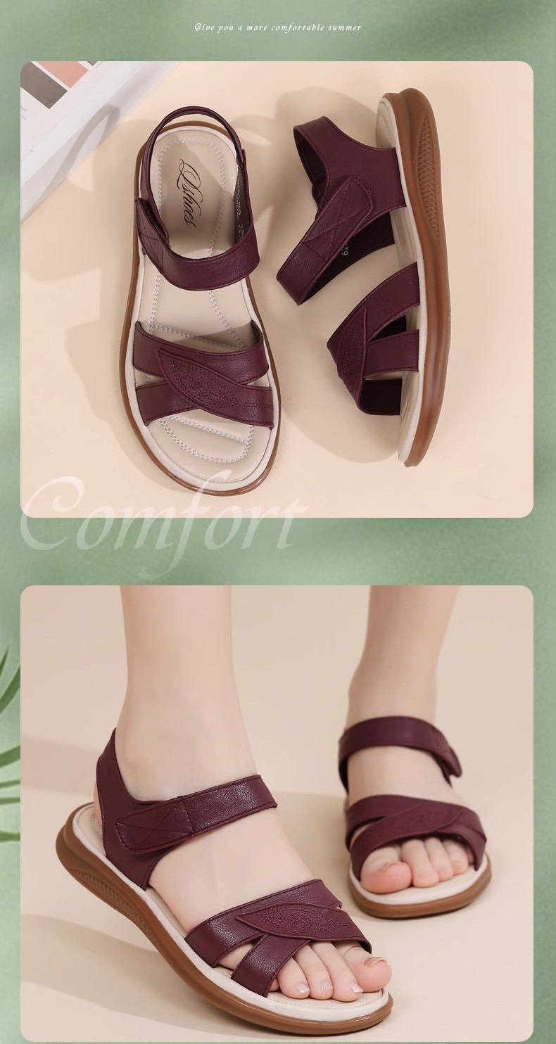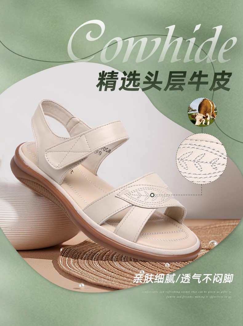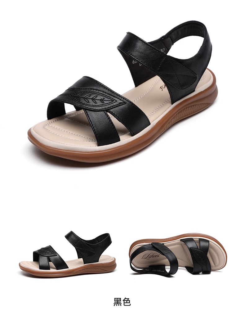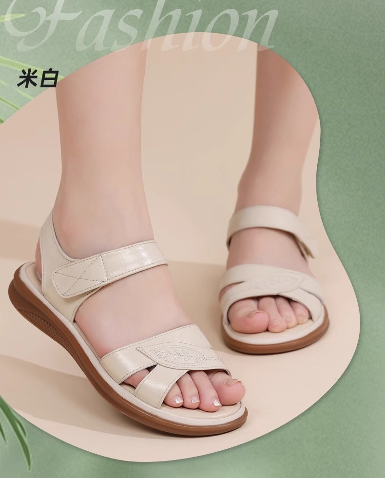 2025 New Style Middle-Aged Mom Sandals Summer Non-Slip Rubber Sole Flat Large Size Comfortable Genuine Leather Women's Shoes