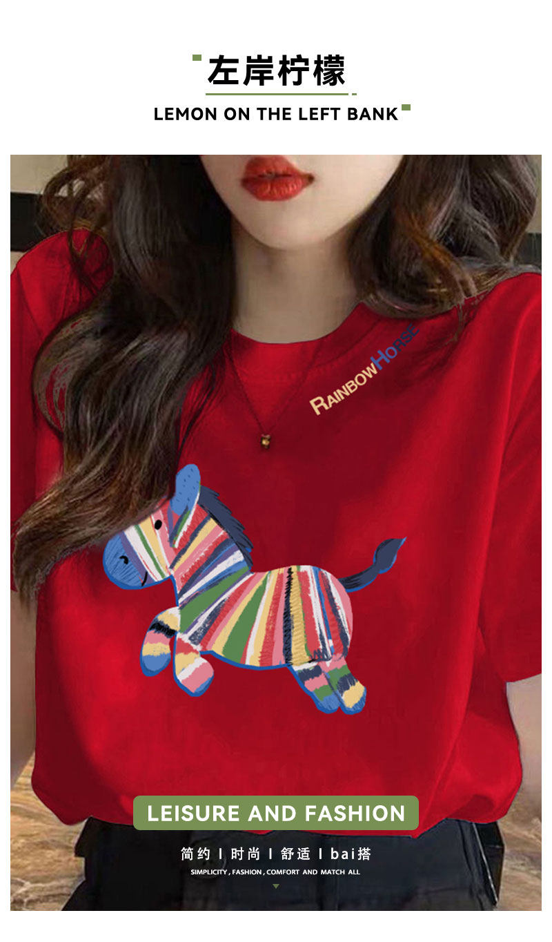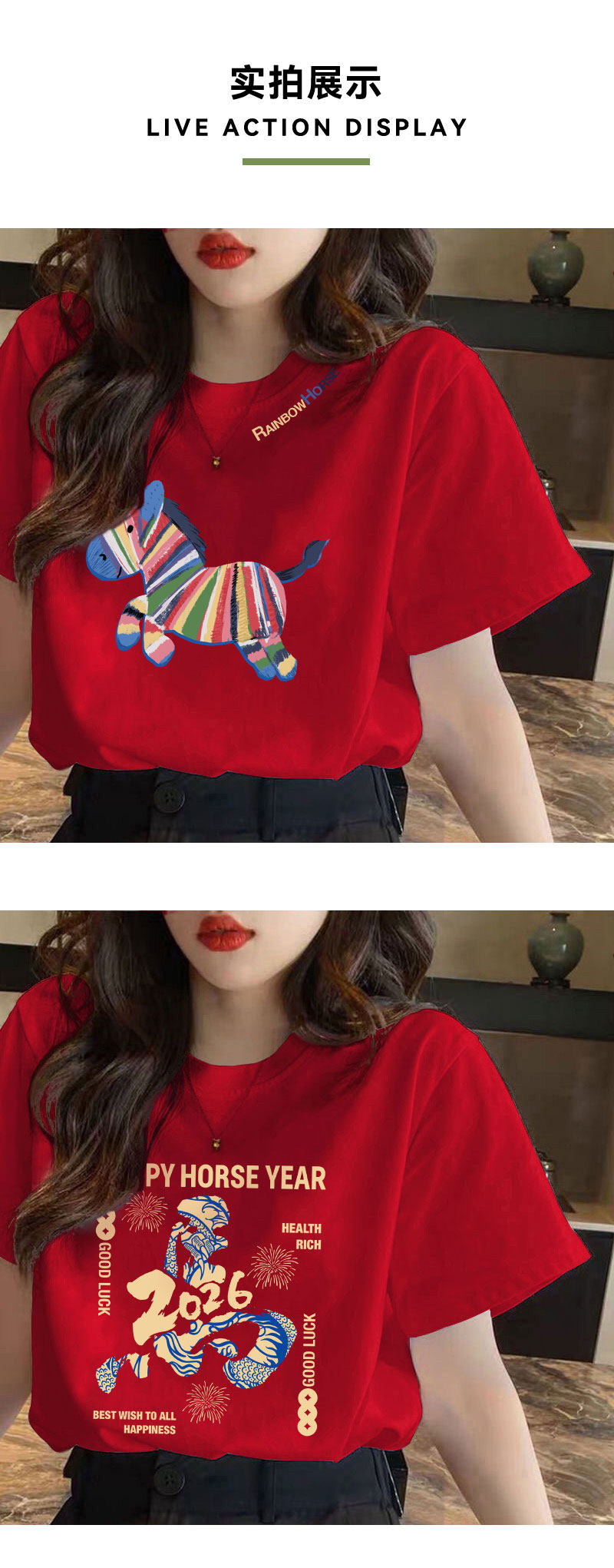 Red Year of the Horse Zodiac Year Clothing New Year Short-Sleeved T-Shirt for Women Pure Cotton 2026 New Style Loose and Versatile New Year Top