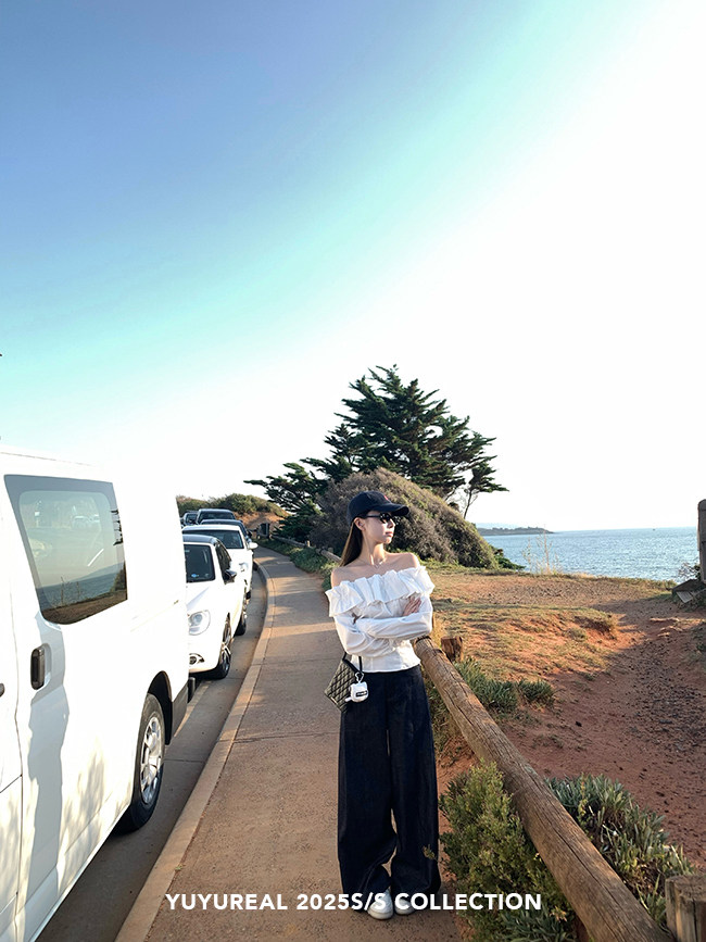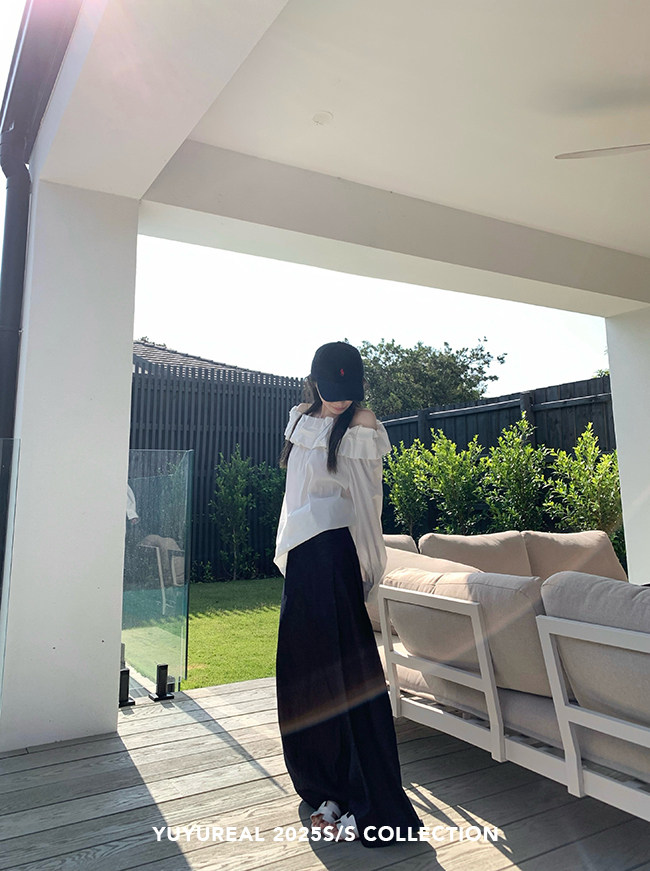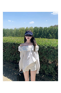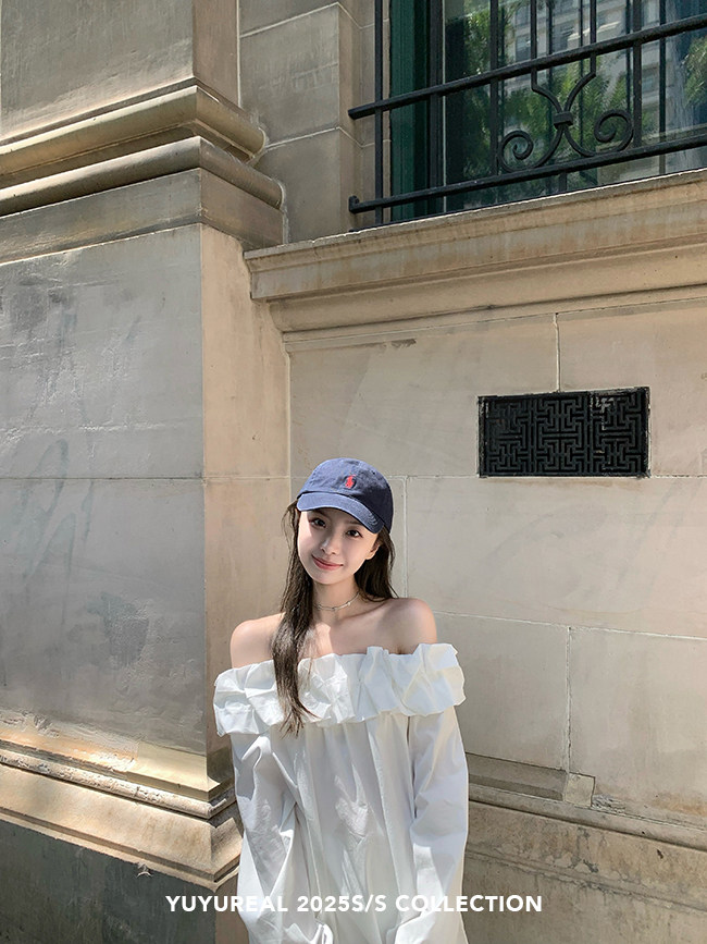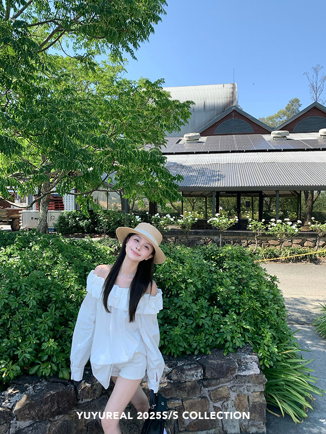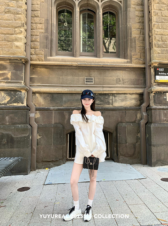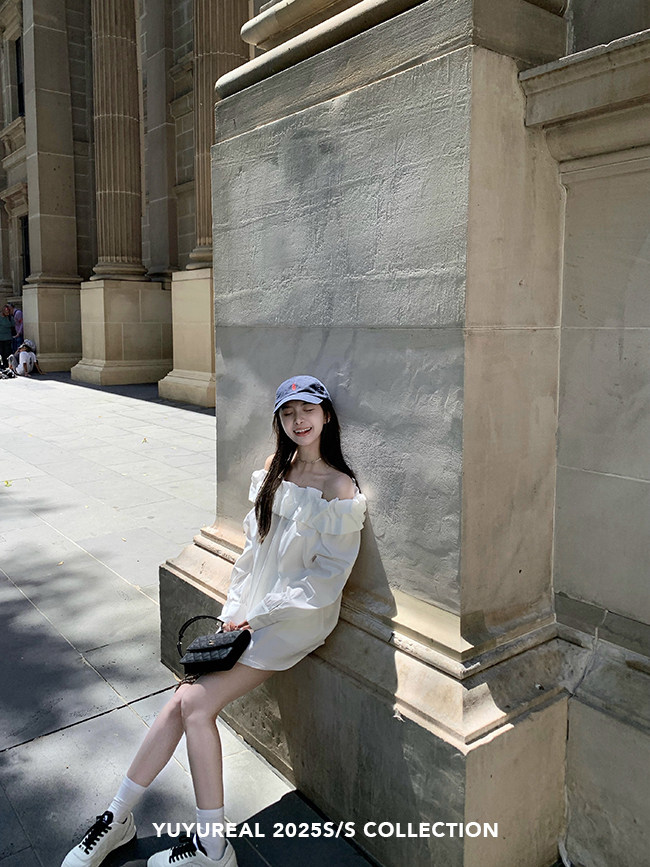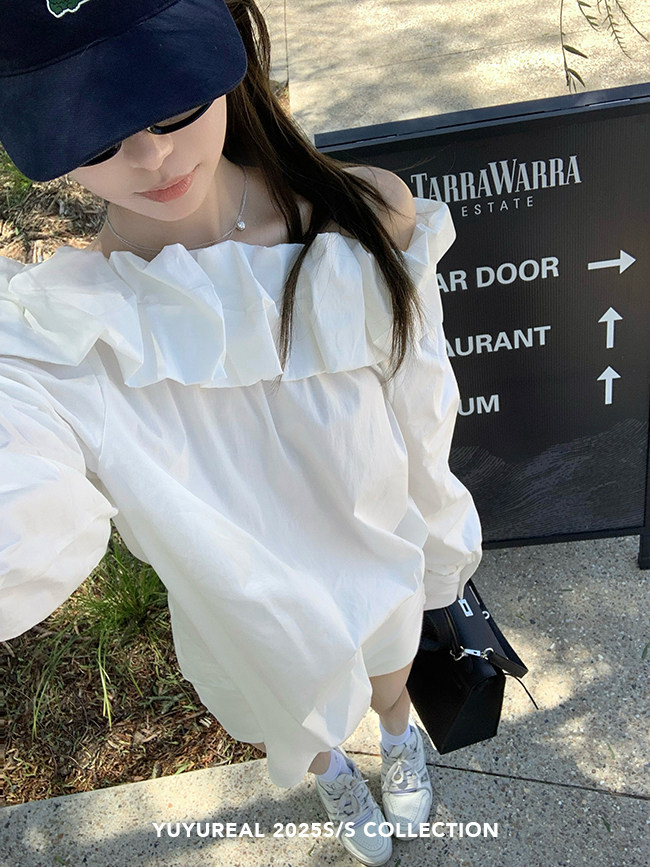 早春大家都喜欢有青春活力感的单品 这个衬衫以云朵为灵感 在经典白衬衫的基础上融入少女元素 乖甜的清冷调调 采用一字肩设计 领口一圈重工捏褶 以橡筋抽绳做出的立体云朵花苞堆积效果 加深浪漫温柔的层次 袖口抽皱做小灯笼袖造型